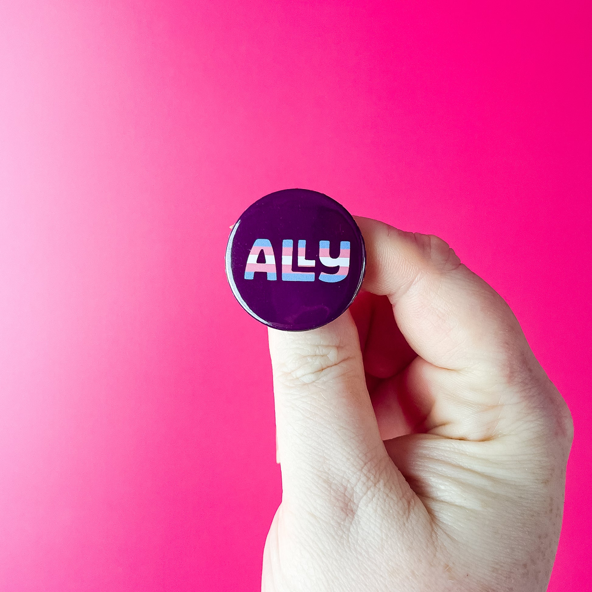 This button pin is a great way to show your support for the transgender community! It features a trans flag design in the word ally, perfect for any ally. Show your solidarity with this unique button pin!