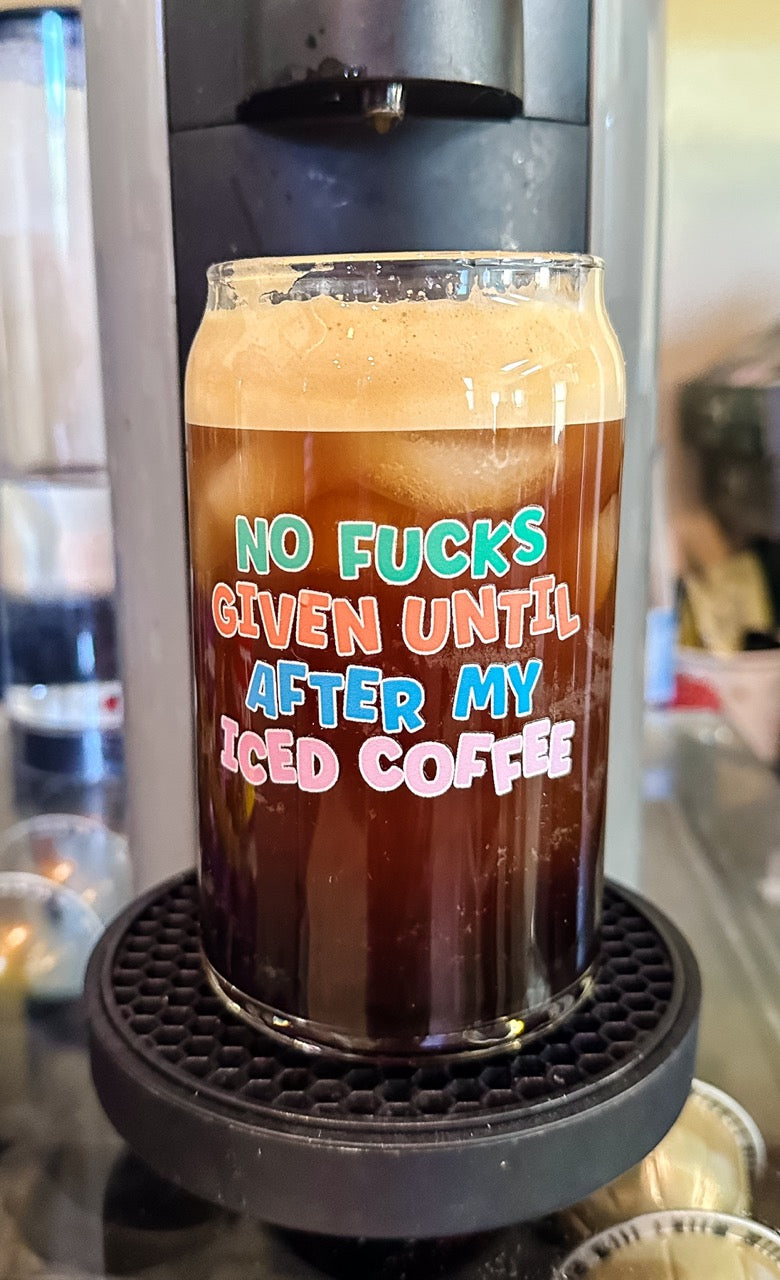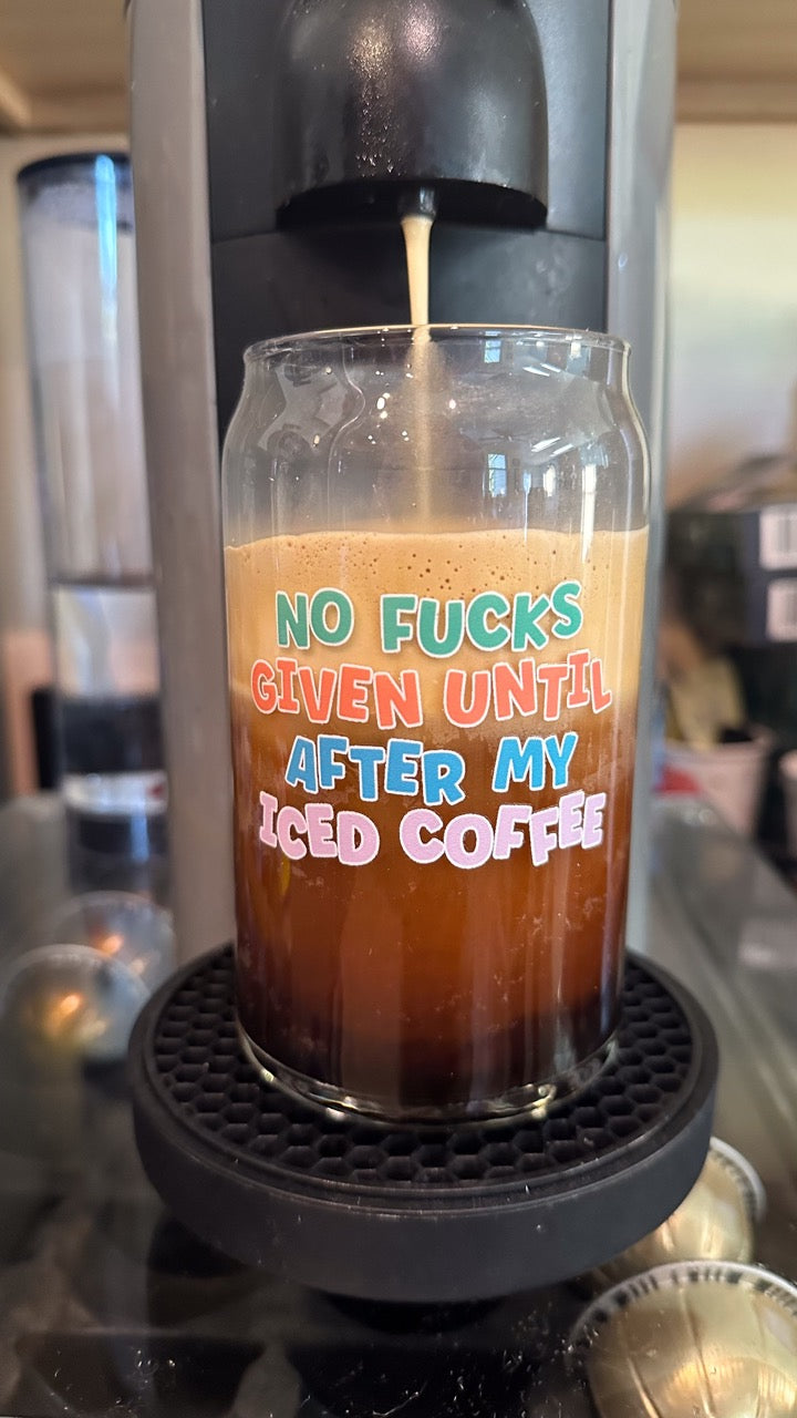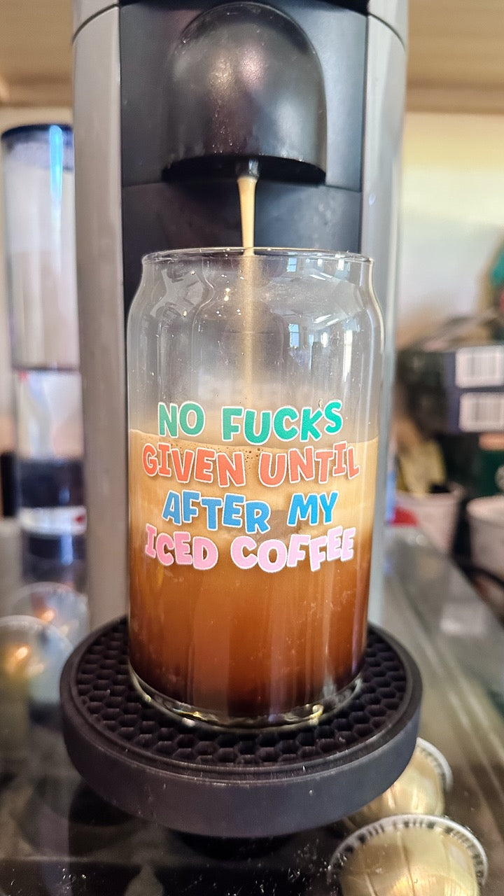 Start your day right with the "No Fucks Given Until After My Iced Coffee" 16oz beer can glass. Perfect for those mornings when you need your iced coffee before you’re ready to deal with the world. This double-sided decal adds just the right amount of humor and attitude to your drinkware collection. Whether you're enjoying iced coffee, cocktails, or a cold beer, this glass makes sure your priorities are clear. Handwash for longevity, because you’ll want to use it daily!