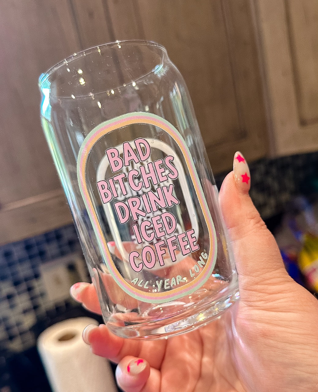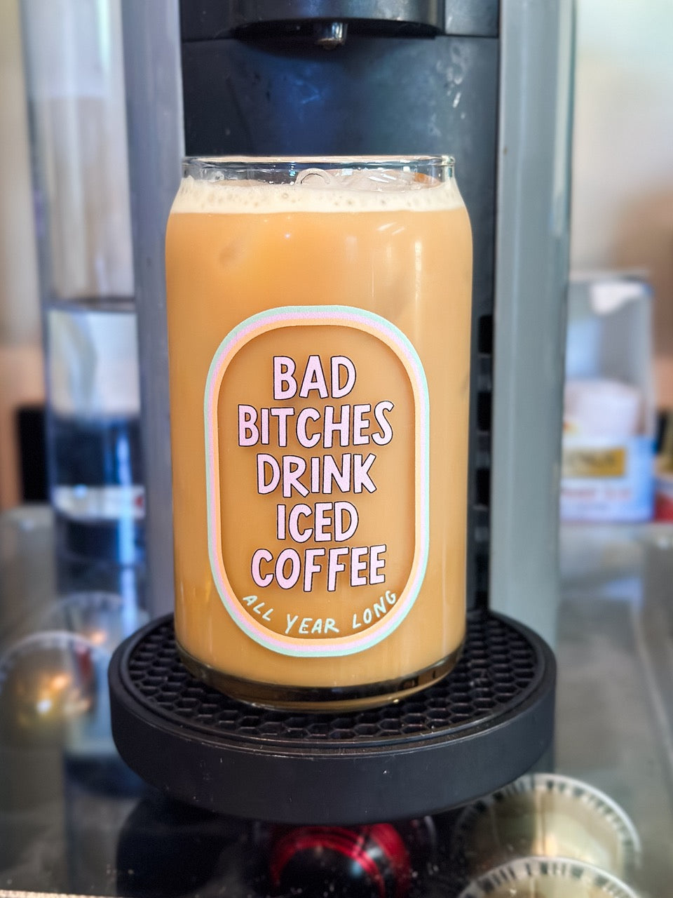 Keywords: bad bitches iced coffee, 16oz beer can glass, iced coffee drinkware, sassy drinkware, iced coffee glass, double sided decal, funny drinkware, handwash recommended, coffee lover gift
