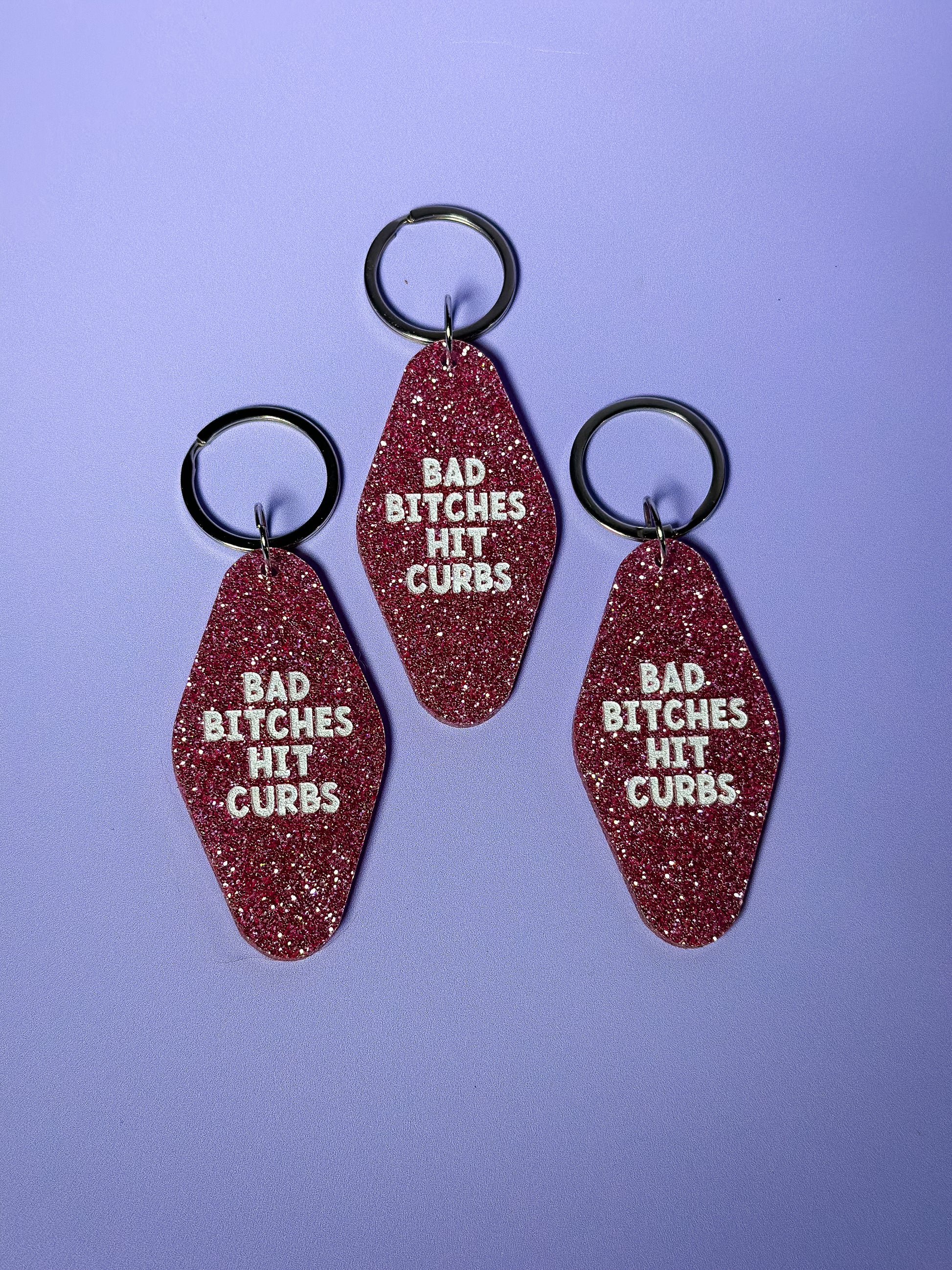 Own your quirks with our 'Bad Bitches Hit Curbs' keychain, dazzling in magenta glitter. At three inches long, it's a sassy accessory that champions those unexpected hiccups in life. Attach it to your keys and let it be your cheeky reminder that even the fiercest of us have their 'hit the curb' moments!