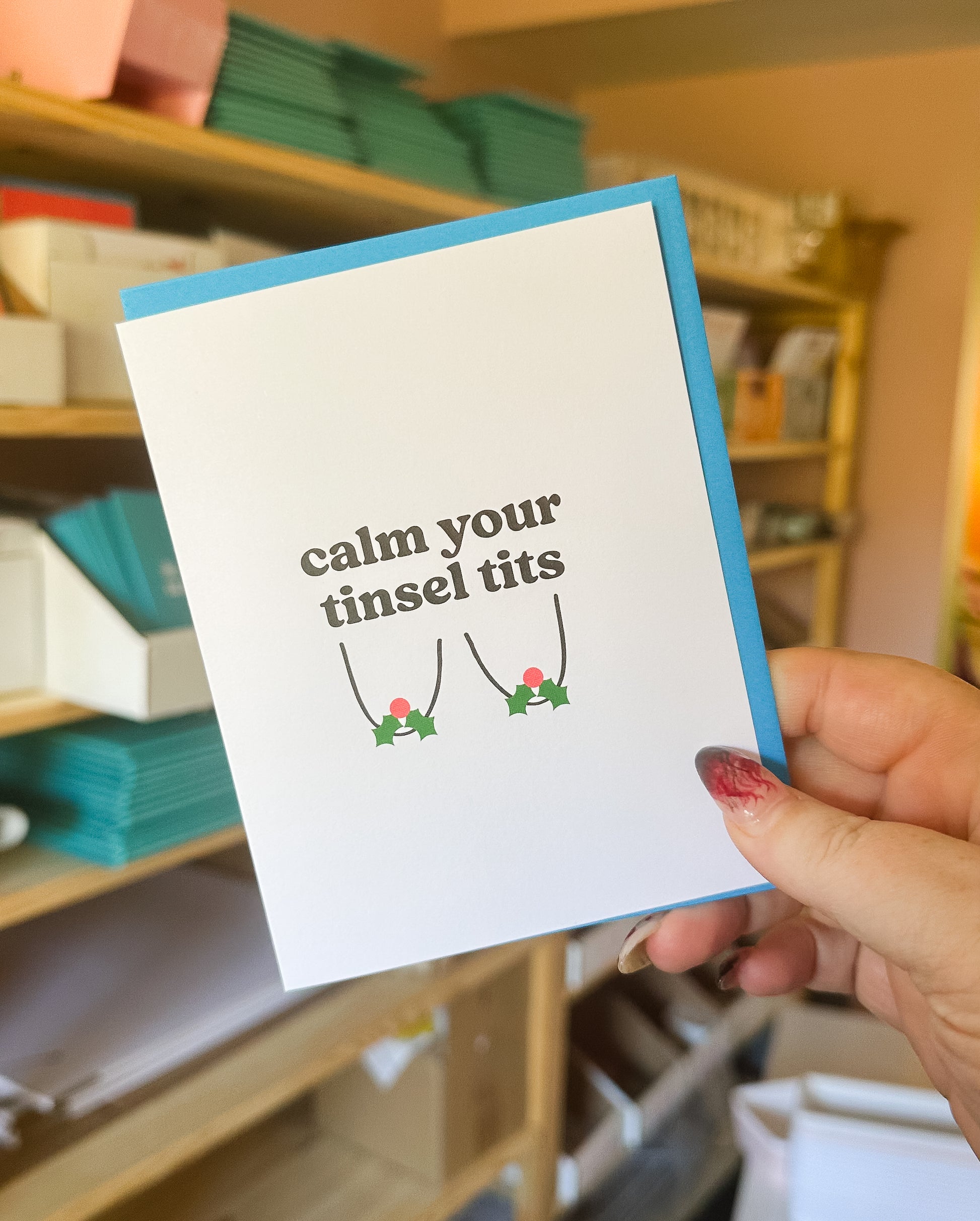 Bring some holiday sass with a card that’s equal parts cheeky and festive! Perfect for friends, family, or anyone who might be getting a little too carried away with holiday stress, this card is a fun reminder to take a breath and enjoy the season. Ideal for holiday parties, gift exchanges, or just to spread a little joy, let them know it’s time to calm down and sparkle on!