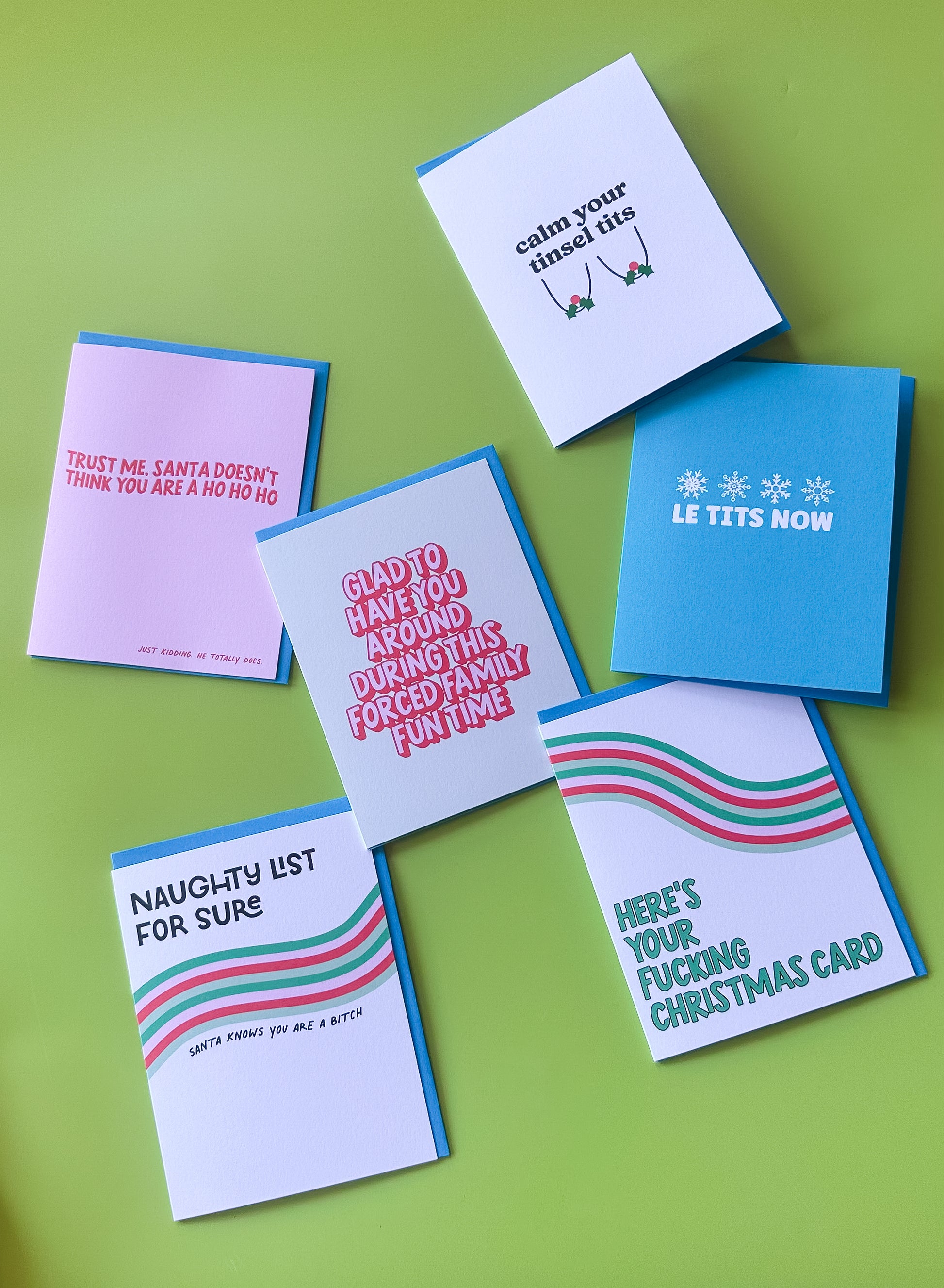 Keywords: funny holiday card, humorous Christmas card, witty holiday greeting, sassy festive card, cheeky Christmas humor.