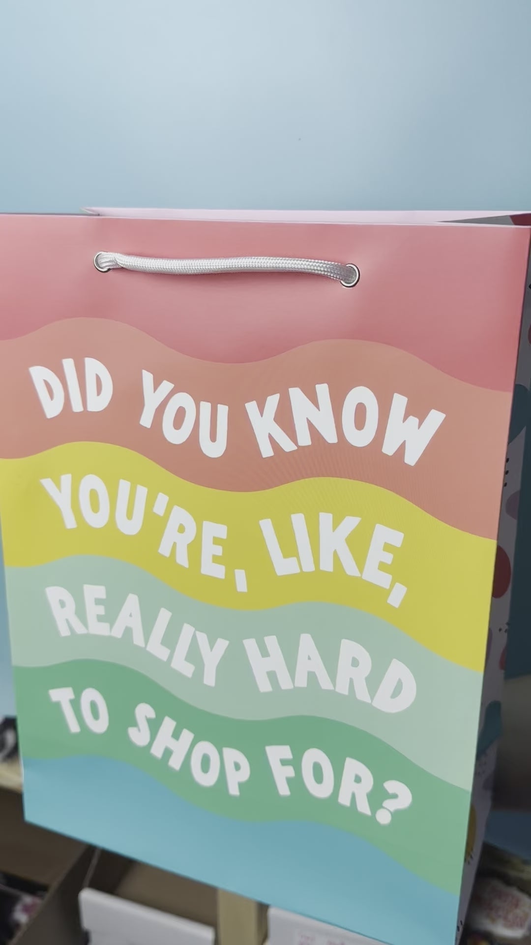 Surprise your loved one with this luxurious "Did You Know You're Like Really Hard to Shop For?" Gift Bag. It's thick and sturdy, with bright colors to make your gift even more special. Perfect for any occasion!