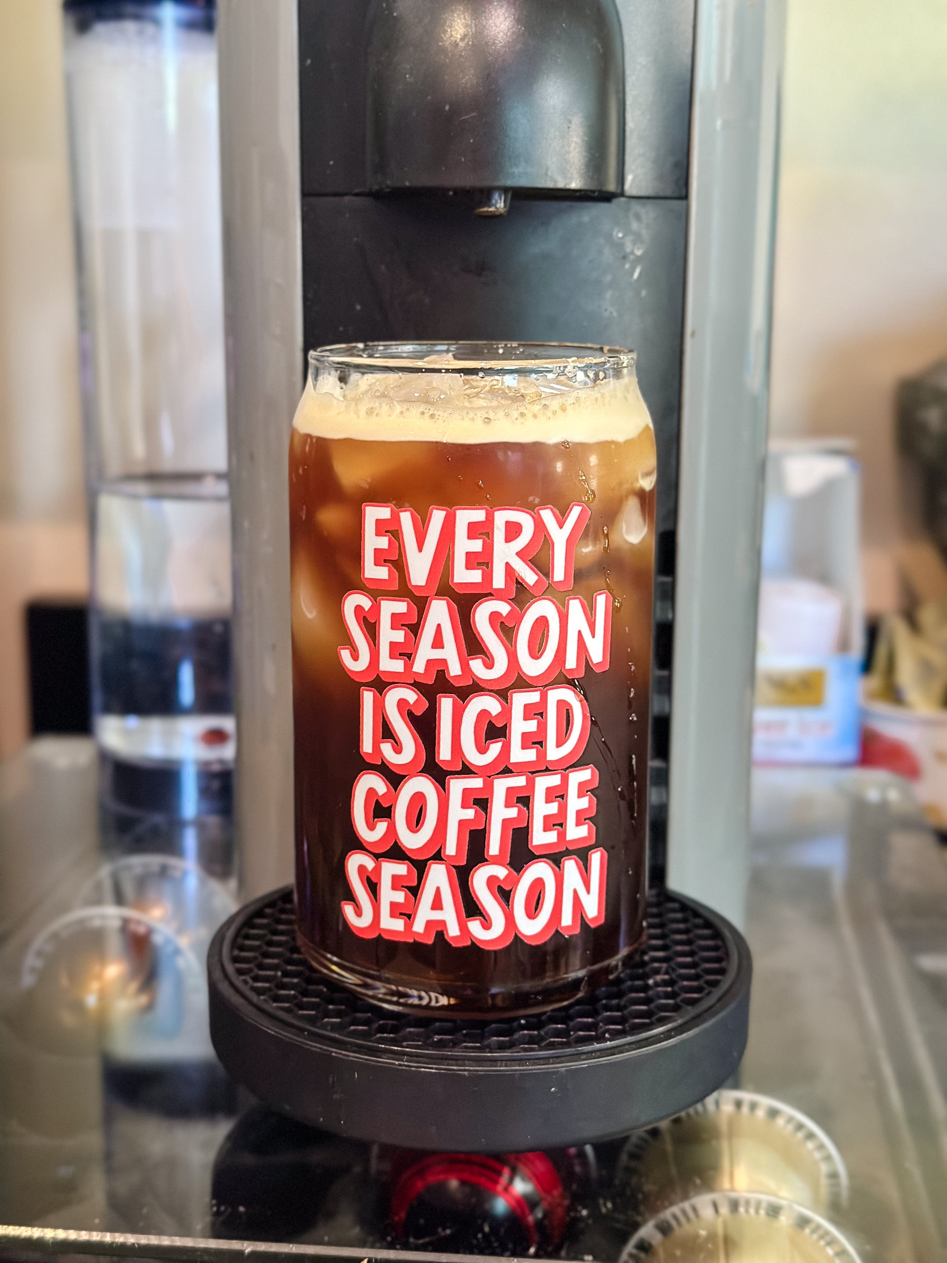 Sip your iced coffee in style all year round with this playful "Every Season is Iced Coffee Season" 16oz beer can glass. Perfect for coffee lovers who know that iced coffee is always in season, no matter the weather. Featuring a double-sided decal, this glass is the ultimate companion for your cold brews, whether it’s summer or winter. Handwash for longevity and let this glass become your go-to for all your iced coffees.