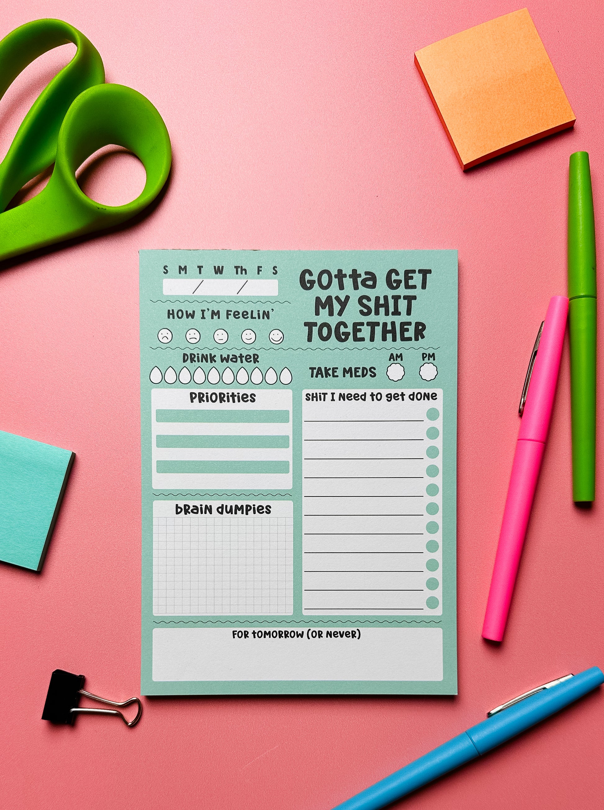 Never forget a thing with the Gotta Get My Shit Together Notepad. This 5x7 in notepad has 50 pages to help you plan your day and remember the important stuff. It includes a '"Gotta Get My Shit Together" daily planner, a meds check, and a brain dump area. Get it together!