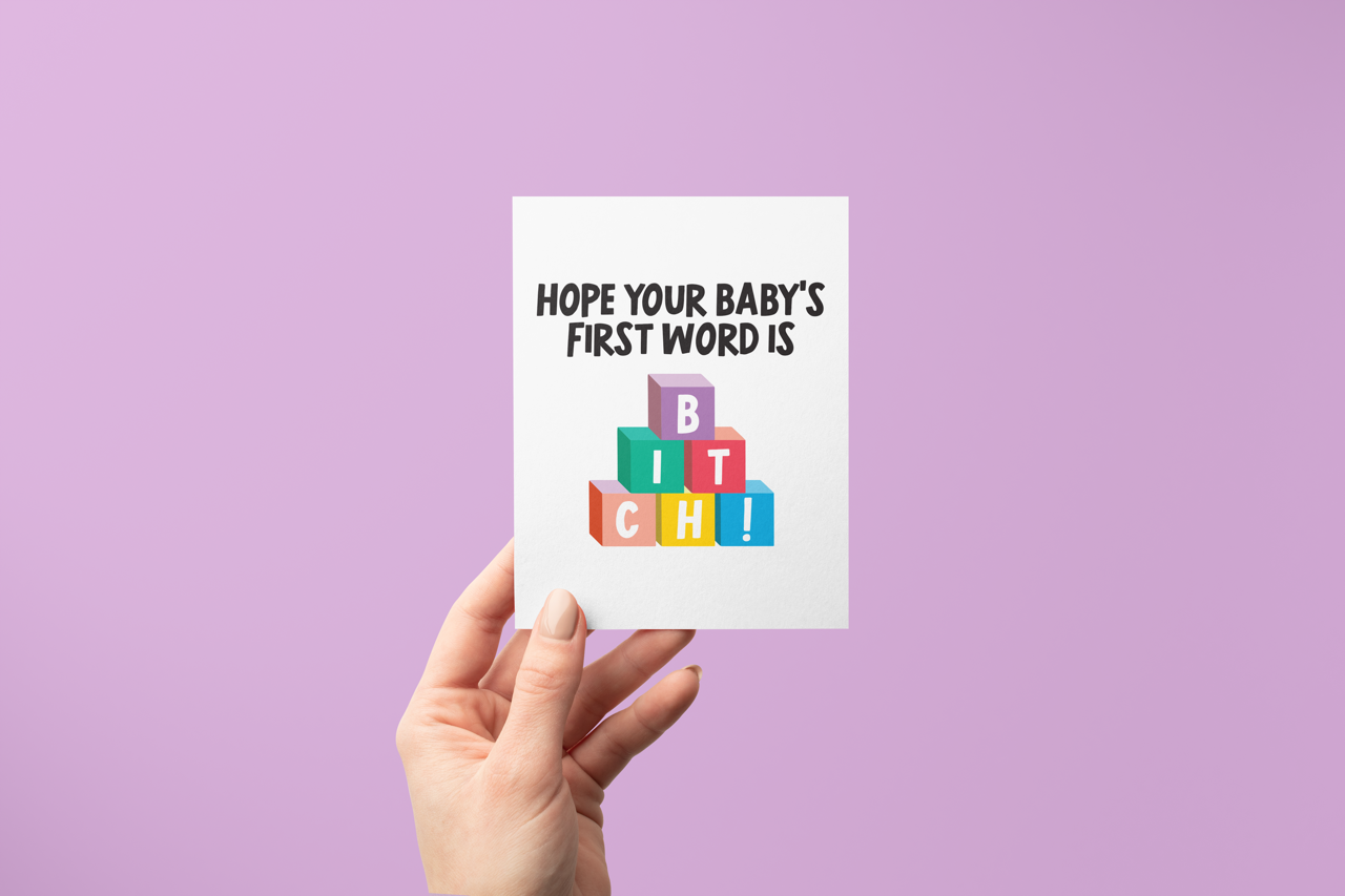 Perfect for new parents with a wicked sense of humor, this card is a hilarious way to celebrate their little one. Whether it’s a baby shower or a new baby greeting, wish them all the best with a cheeky twist. Because every parent secretly hopes their kid's first word will make a memorable (and funny) impression.