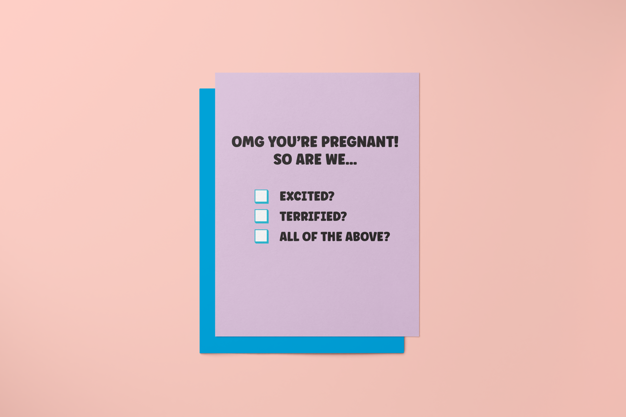 Celebrate their big news with a card that captures all the emotions! Perfect for new parents-to-be, this card brings humor and honesty to the rollercoaster of feelings that come with expecting a baby. Whether they're overjoyed, nervous, or a mix of both, this card acknowledges it all with a cheeky smile. Ideal for baby showers or pregnancy announcements, it's the perfect way to share in their excitement and anxieties.