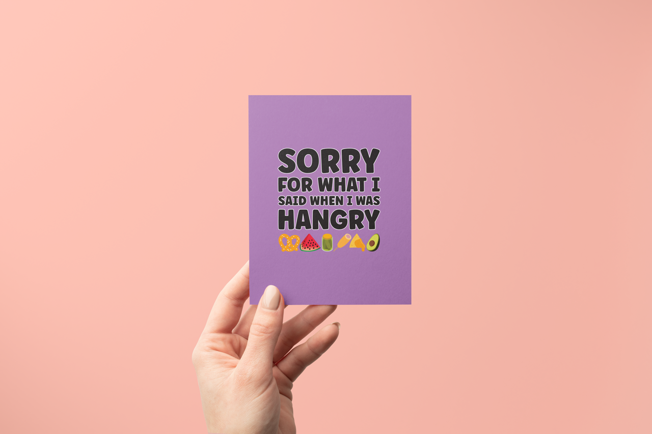 Apologize with a smile and a nod to one of life's most relatable feelings—hanger! Perfect for friends, family, or loved ones who’ve experienced your less-than-charming moments when hunger struck, this card delivers your apology with humor. Ideal for mending fences and bringing a laugh, let them know you’re sorry and that it’s all good now that you’re well-fed. Because we all know that hanger is a force to be reckoned with!