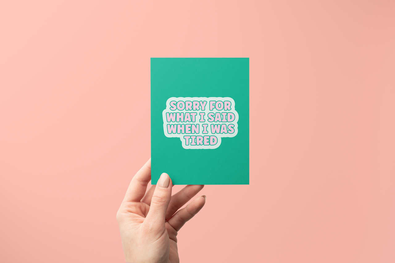 Keywords: funny apology card, humorous sorry card, witty tiredness card, sassy apology card, cheeky forgiveness card.