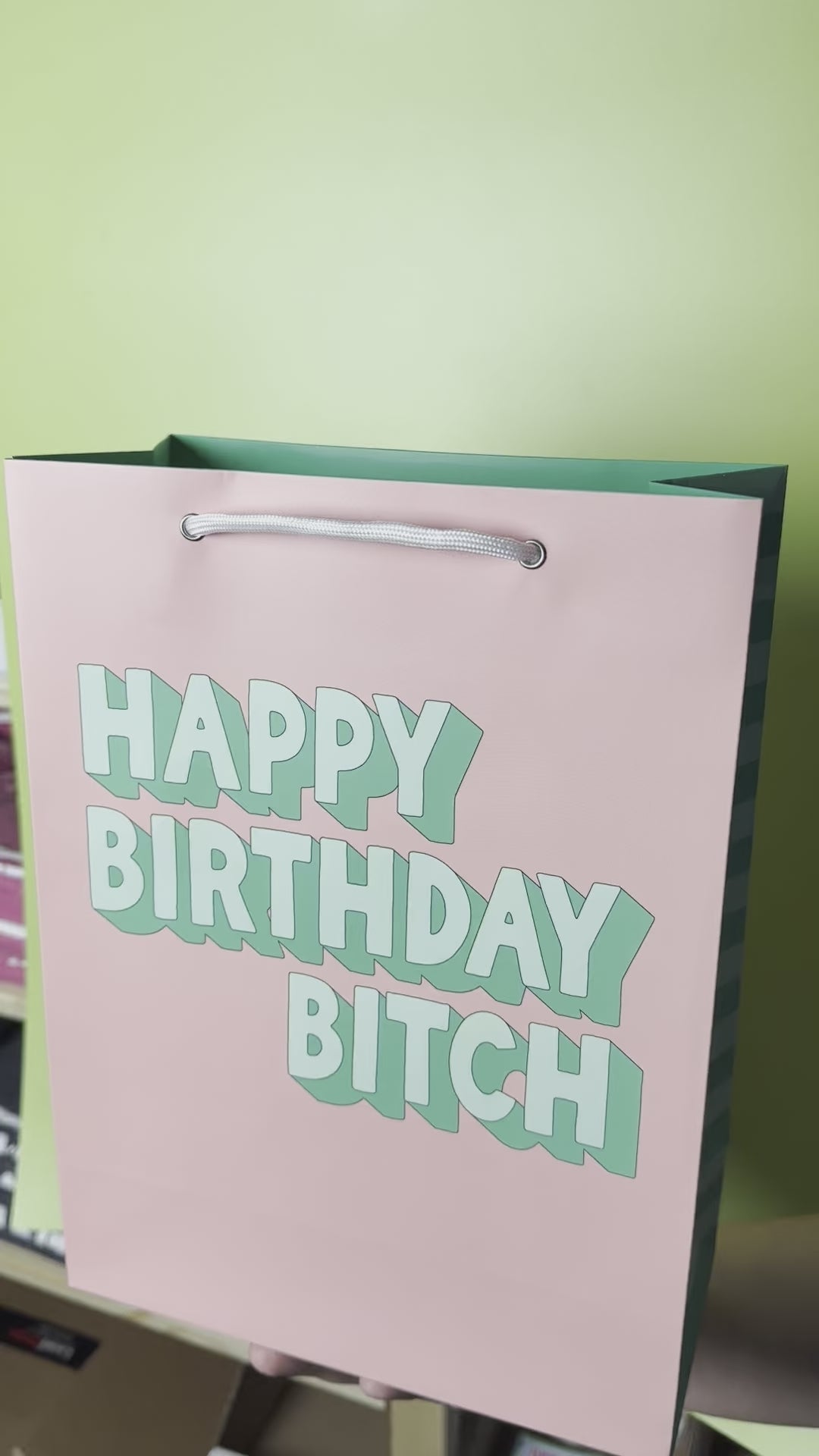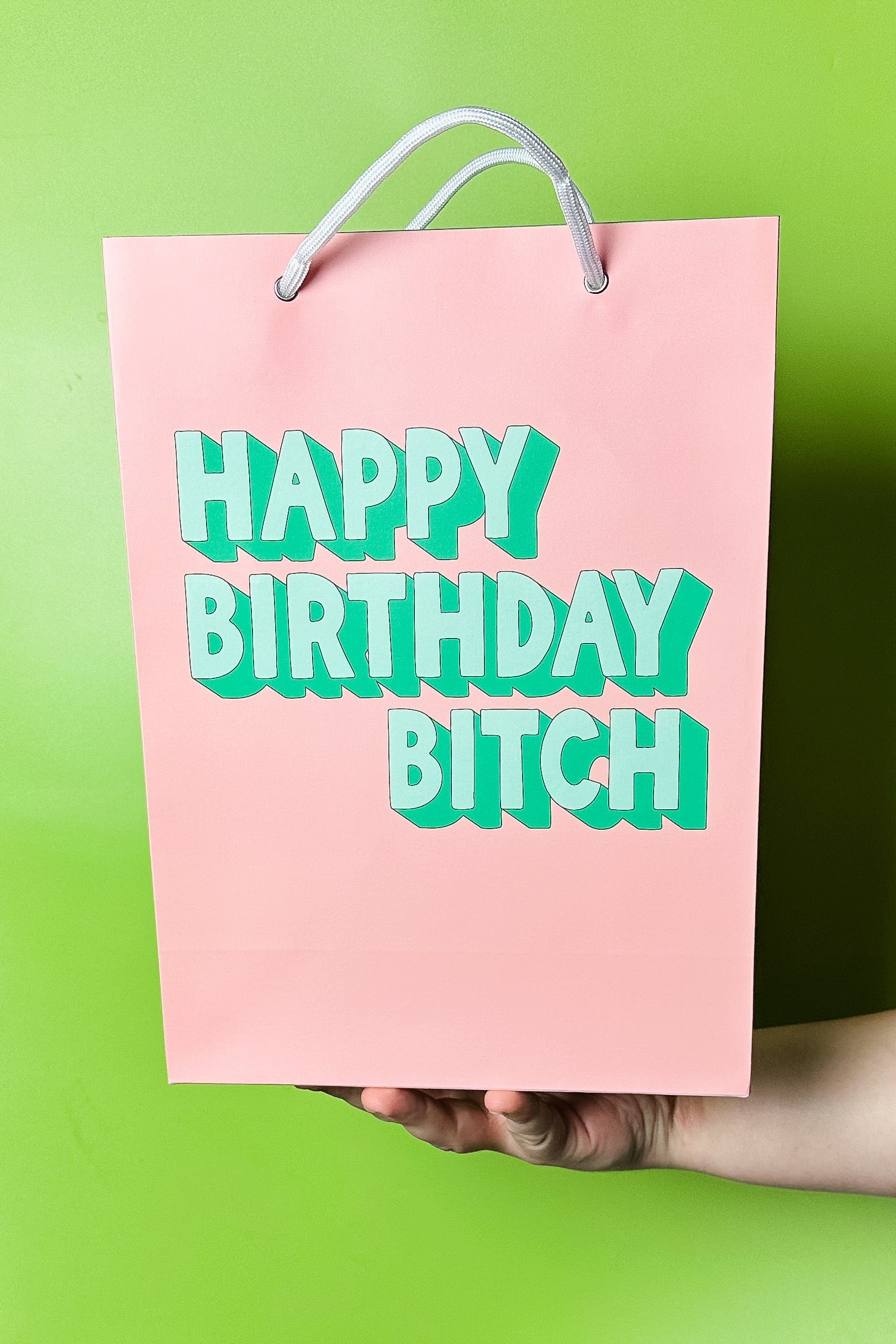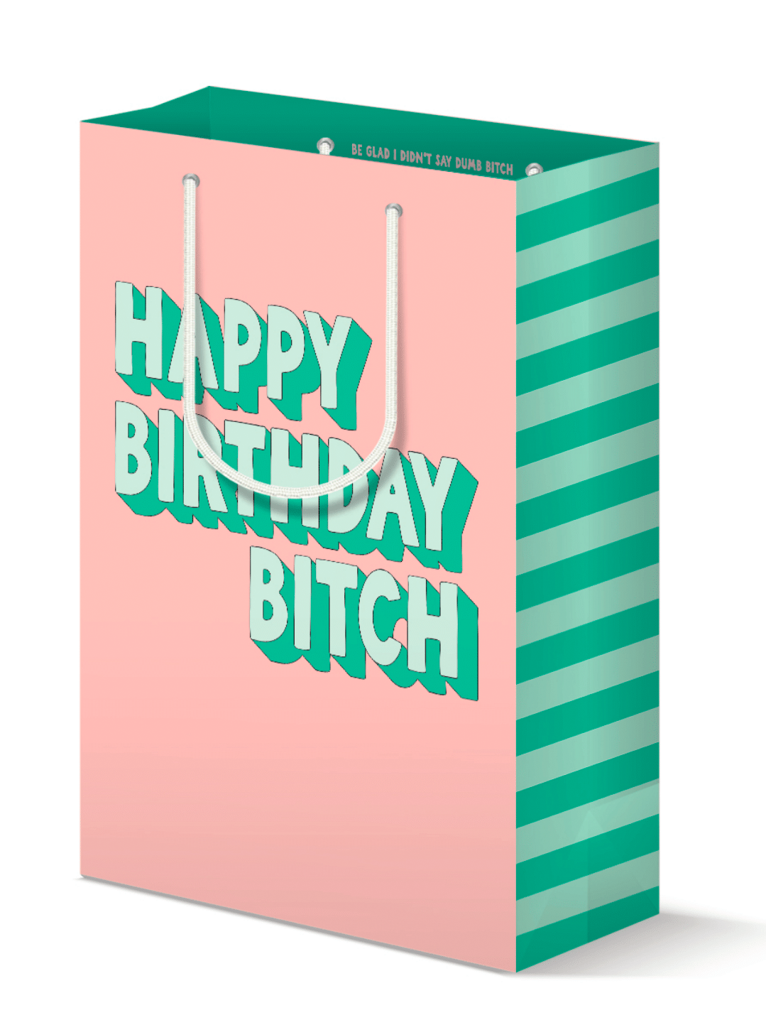 Gift your favorite person to this luxurious gift bag, featuring the bold message "Happy Birthday Bitch!" Perfect for a special celebration. Don't forget to show them the hidden message right inside the brim!