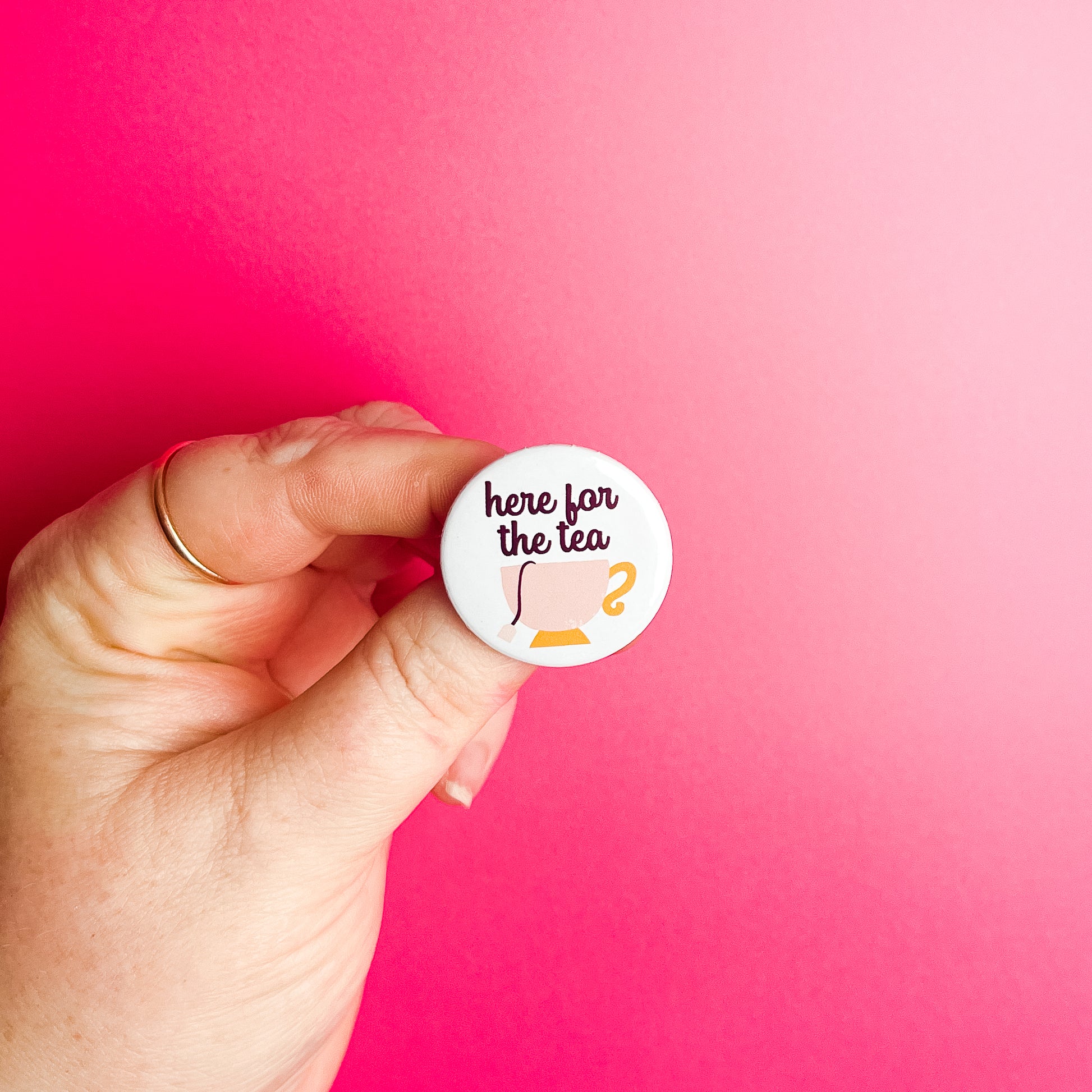 Have you ever wished you could hear the tea without stirring the drama? Our here for the tea button pin is the perfect way to express your love for gossip without the accompanying drama. Whether you're headed to a party, out on the town, or just having a casual day, this fun button pin is sure to be a conversation starter. Show off your love for the tea with this stylish and playful pin!