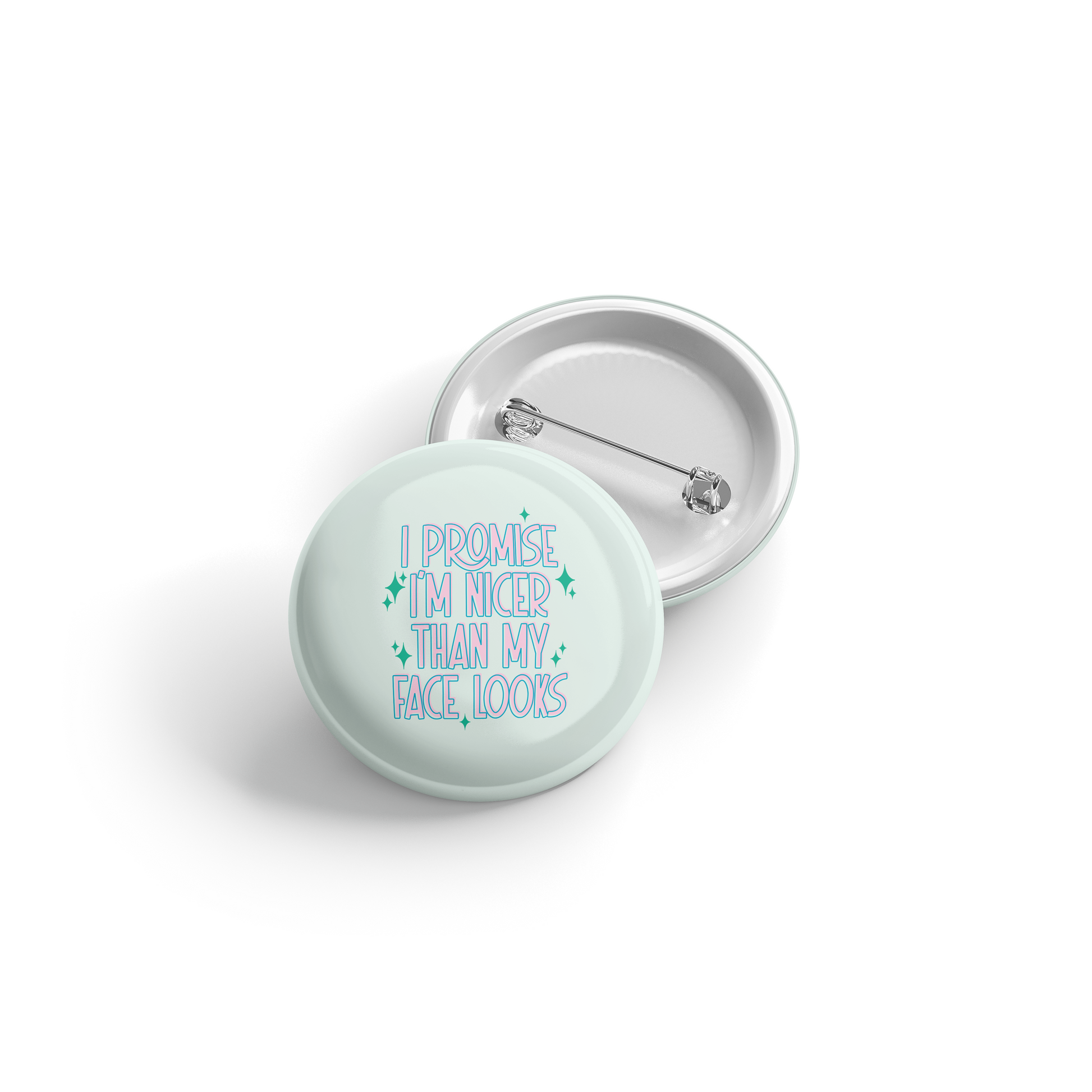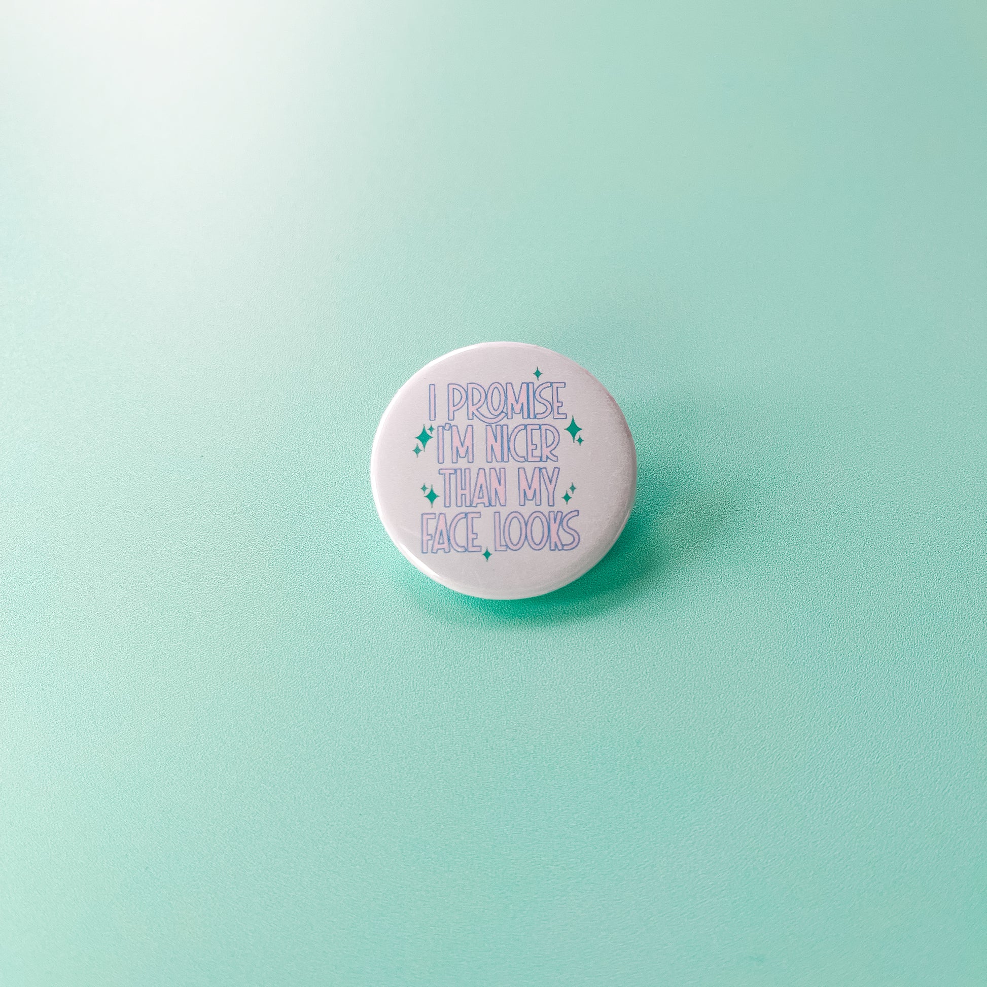 Are you tired of people thinking you're grumpy when you're actually quite friendly? Show them your true colors with this RBF-inspired button pin! Featuring the phrase "I promise I am nicer than my face looks," this pin is the perfect way to show that you don't take yourself too seriously. Whether you wear it to work, school, or a night out, get ready to turn some heads with this unique and humorous accessory!