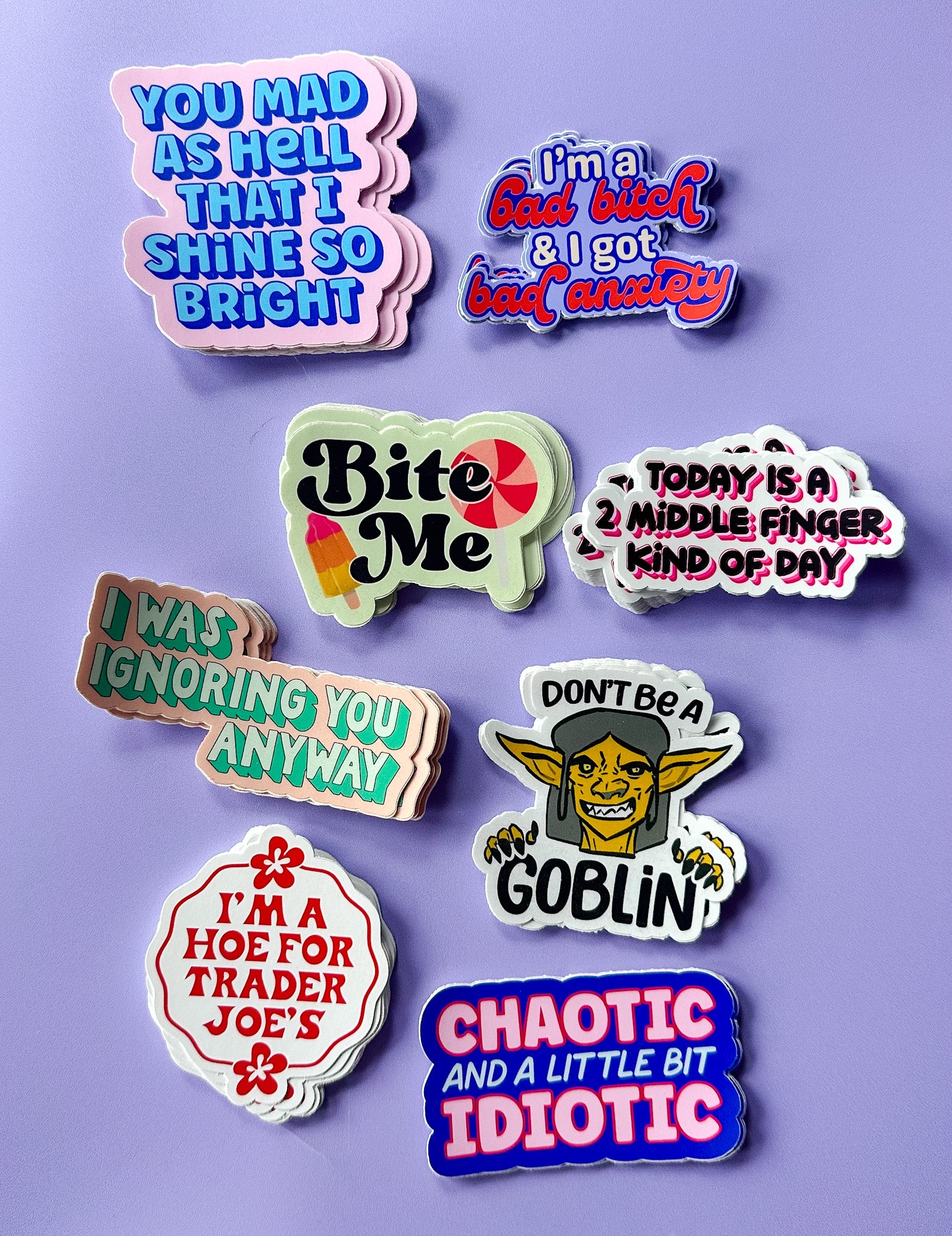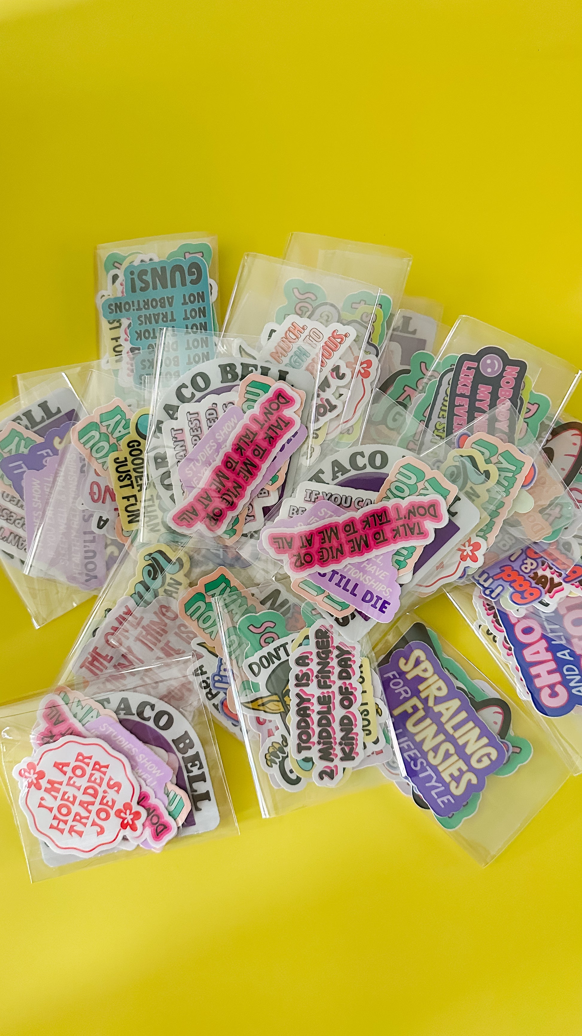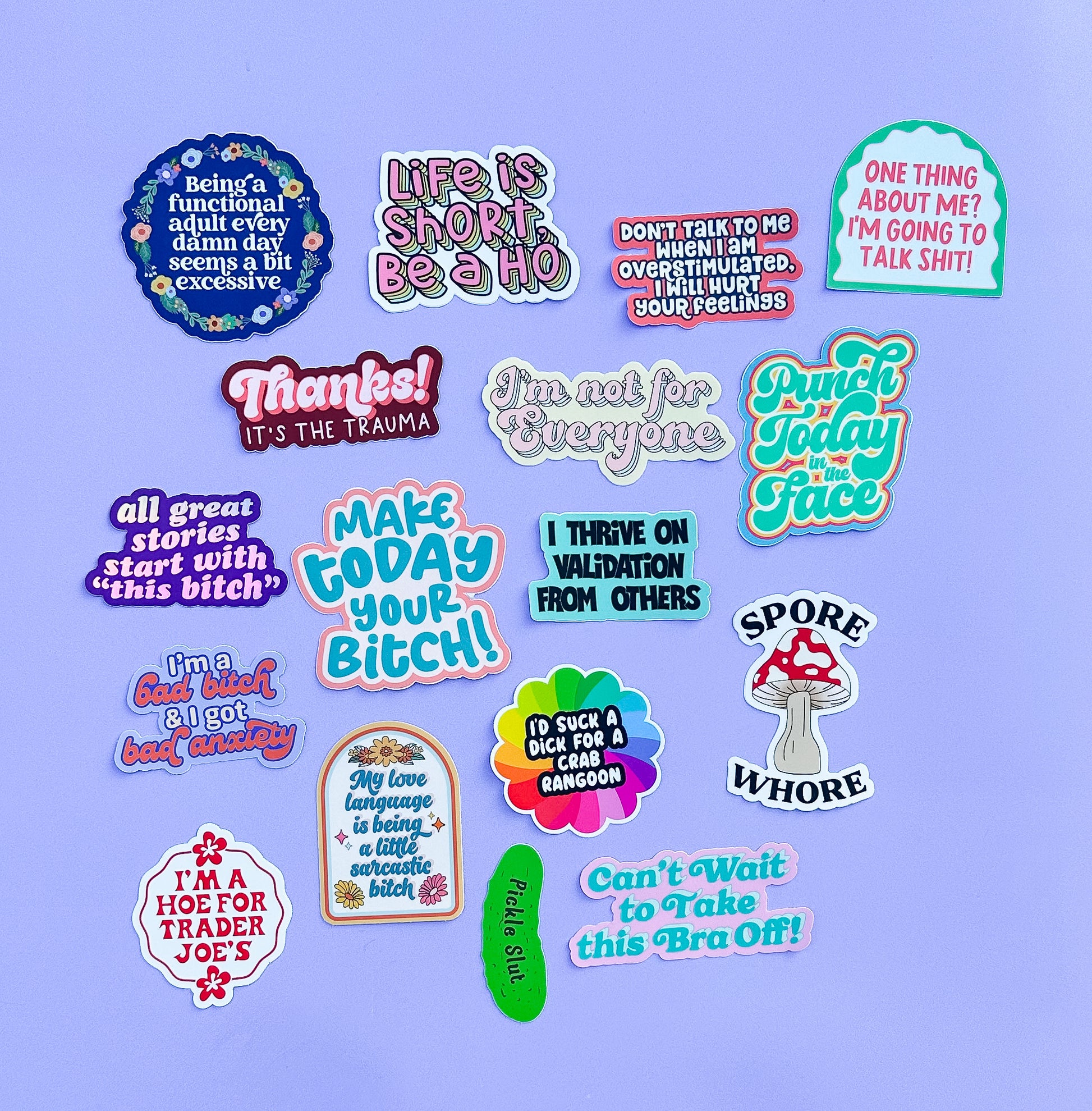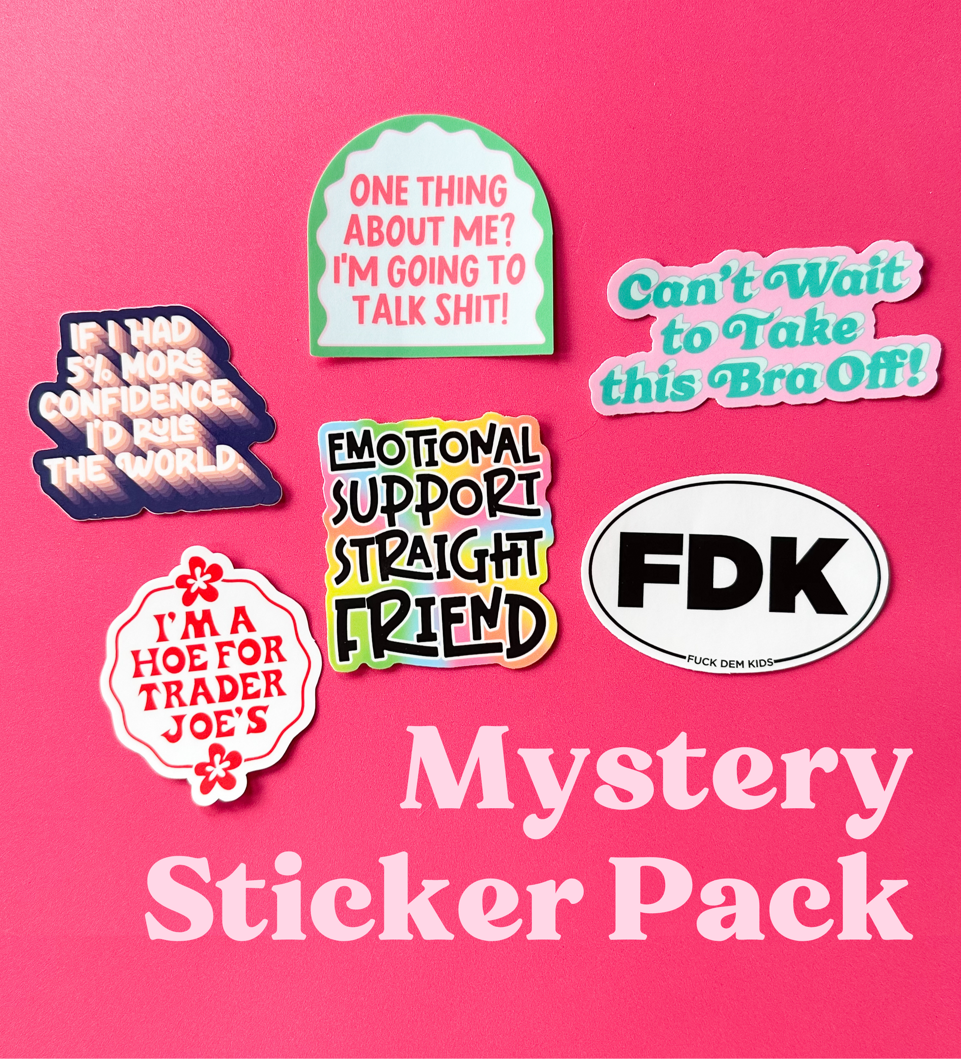 Overthinking is exhausting. let me make it easy. Mystery Sticker Packs are available in 5, 10, or 20 stickers, with no repeats, and may include B-grade, old Patreon exclusives, or retired designs. Each one hilariously awesome in its own way. Stick them on your laptop, water bottle, or anywhere that needs a little extra personality. Dishwasher-safe, weatherproof, and guaranteed to make your life more fun!!