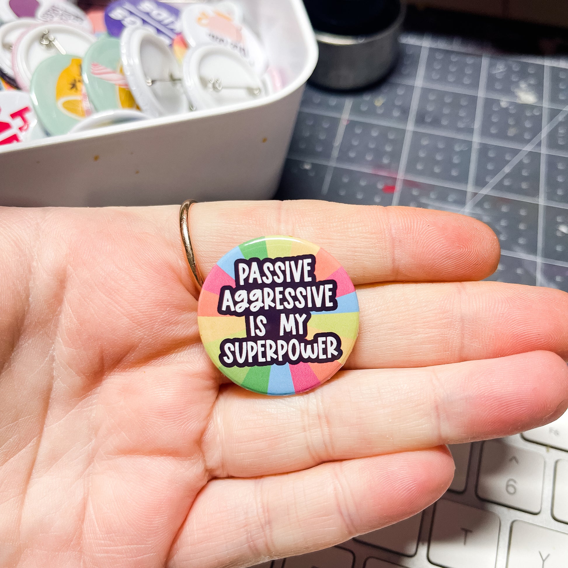 Add a bit of humor to your wardrobe with this Passive Aggressive is My Superpower Button Pin! This stylish pin features a bright design and bold font that is sure to grab attention. Whether you’re wearing it on your jacket, backpack, or cap, this pin is the perfect way to show off your passive-aggressive attitude in a lighthearted way. So, don't be afraid to let your inner passive aggressor out and let everyone know that your superpower is in full force!