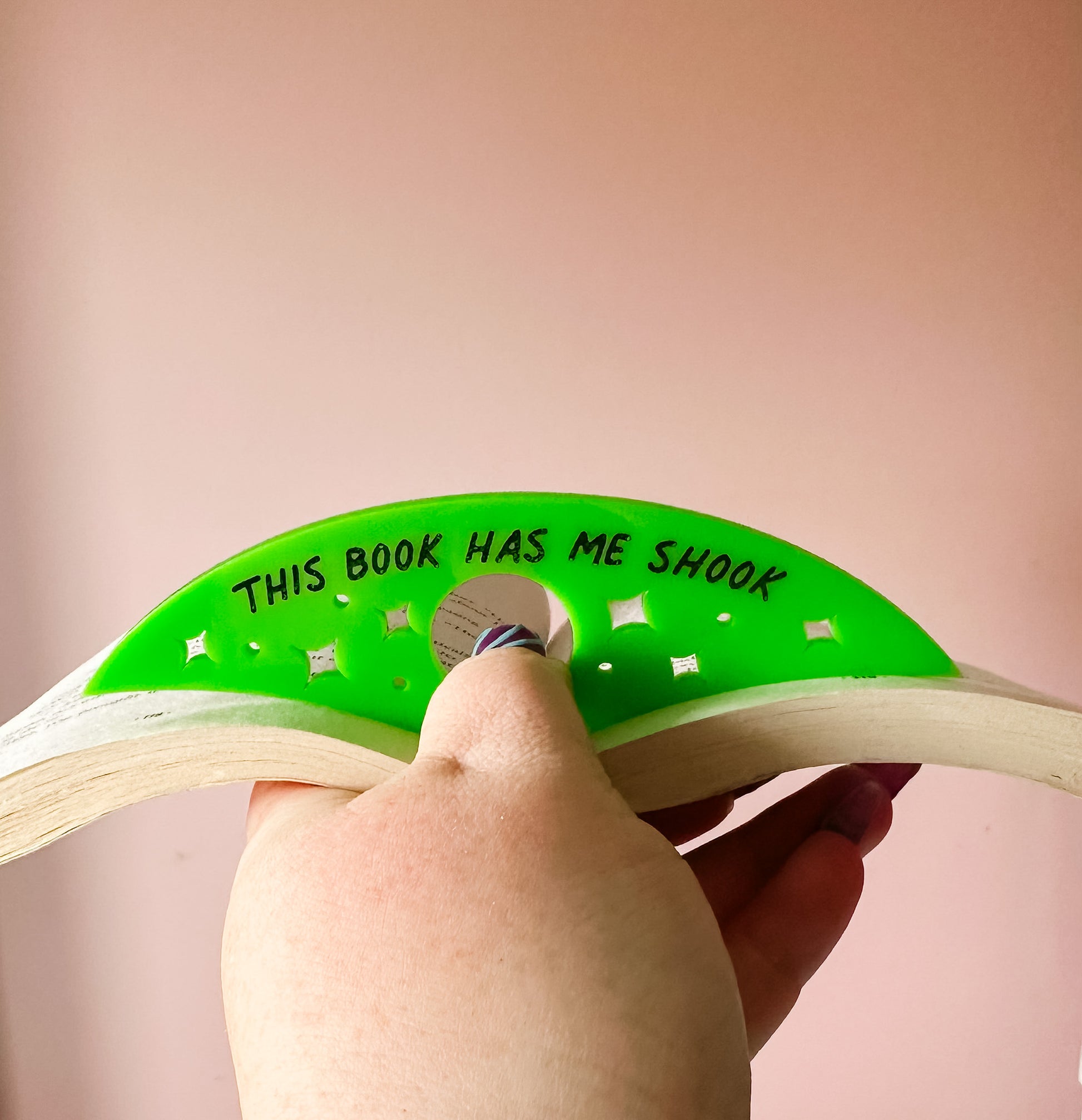 Keywords: lime green book accessory, page spreader for avid readers, shocking book tool, fun reading gift, bold book lover gadget.