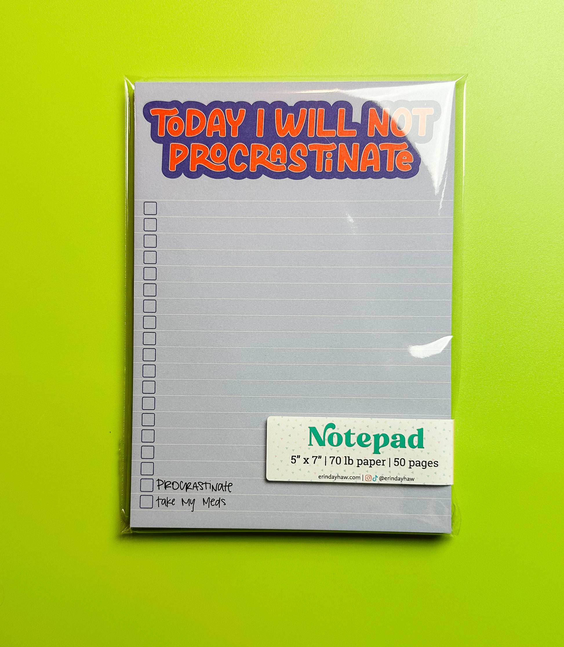 This 5x7” notepad is perfect for staying focused and productive. With 50 pages and a fun reminder to not procrastinate, today could be the day you finally finish that project.