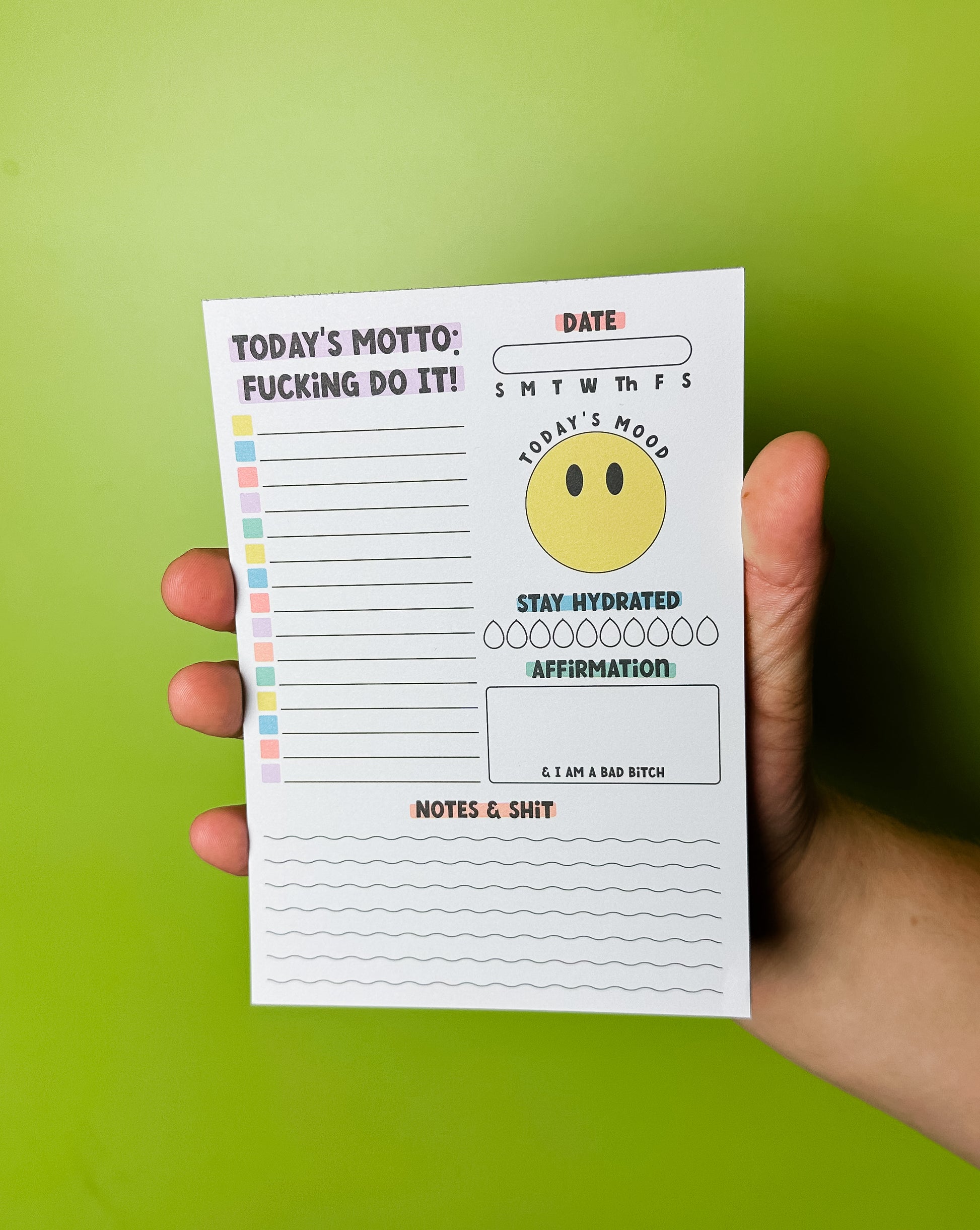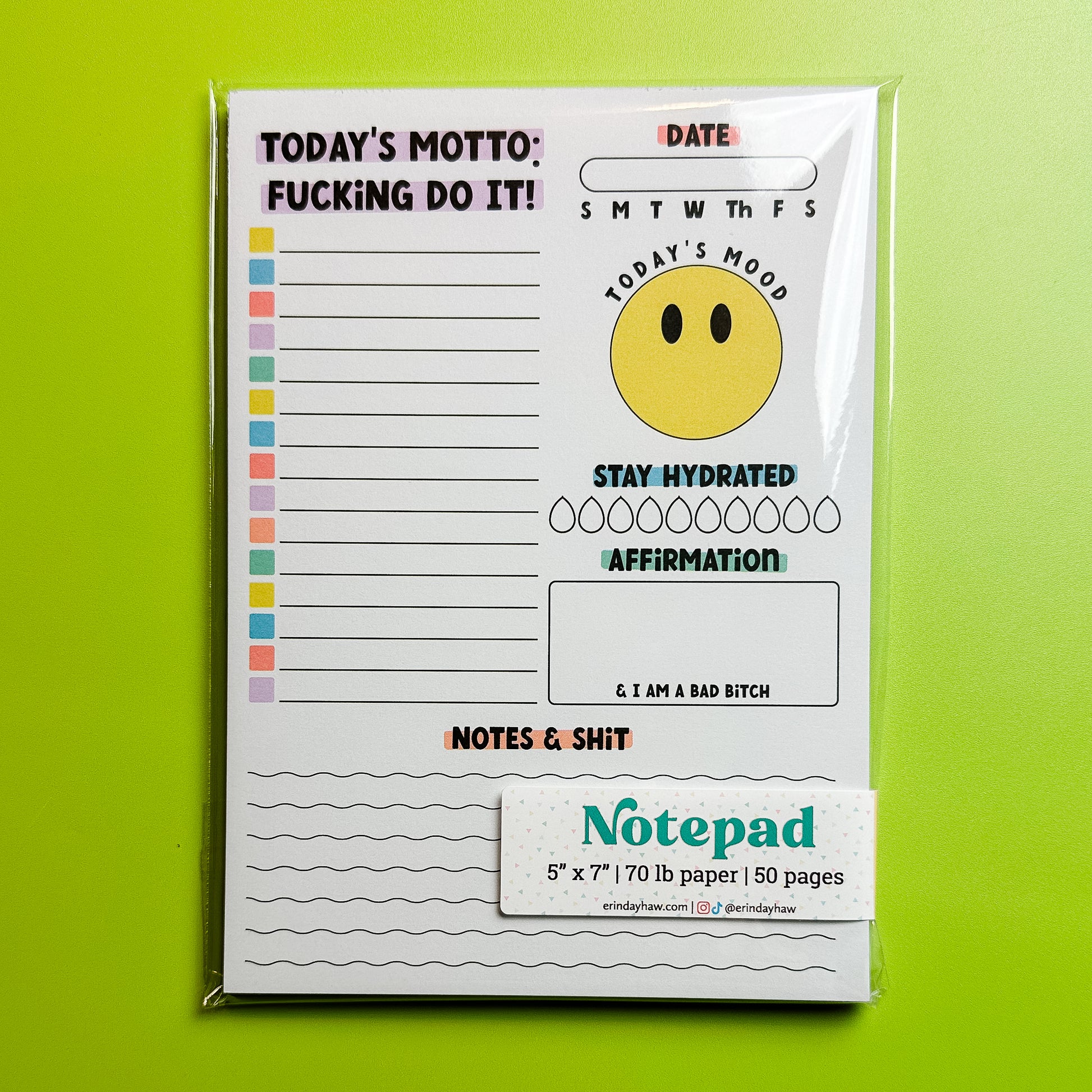 "Today's Motto: Fucking Do it" notepad -- make it happen! This 5x7 in notepad has 50 pages to keep track of your to-dos, daily planner and mood tracker. Get organized, motivated, and ready to do it!